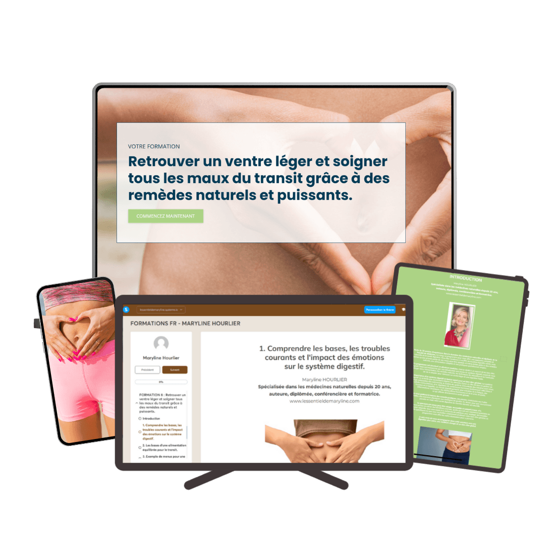 Retrouvez 9 modules ultra-détaillés ainsi qu'une série de vidéos explicatives dans chacun des modules de la formation. Mon but est de vous fournir les maximum de valeur et de connaissances afin de soulager naturellement ballonnements, digestion difficile et troubles du transit grâce à des remèdes puissants, simples et efficaces.
