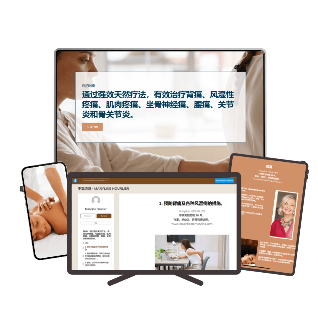 非常有针对性的培训、建议、窍门和疗法,并以非常容易理解和简单的方式提醒病症。 我的背痛已经持续了几个星期(剧烈疼痛),因此我使用精油将课程中的疗法付诸实践,不到一个小时我就感觉疼痛减轻了,这给我留下了深刻的印象。 效果非常快。 干得好,谢谢你们。