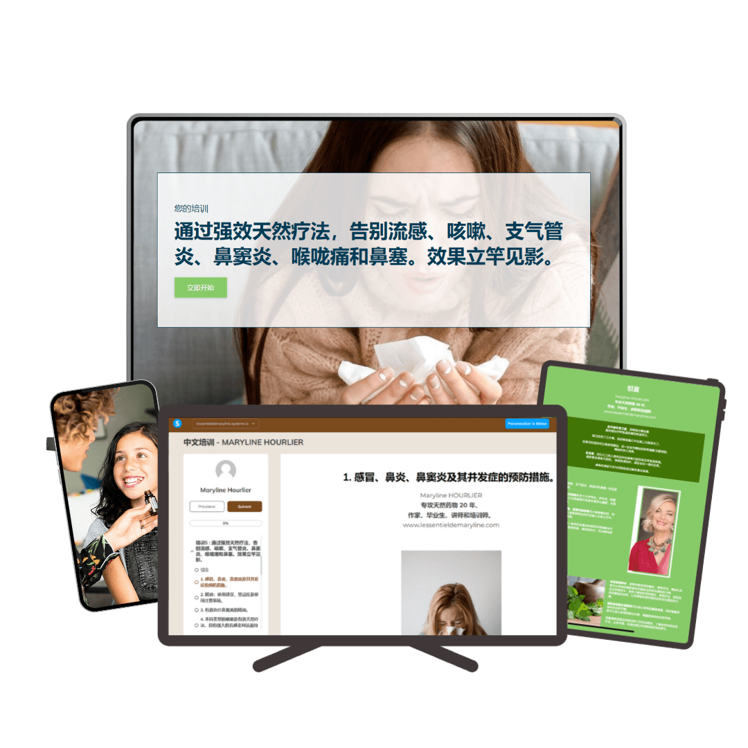在每个培训模块中,您都将看到9 个超详细的模块 和一系列讲解视频。 我的目标是为您提供尽可能多的价值和知识,帮助您自然缓解流感、咳嗽、支气管炎、鼻窦炎、喉咙痛和鼻塞。
